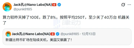 12月15日,原嘉楠科技董事会联席主席,现Nano Labs创始人及董事长孔剑平引用其此前推文「新疆比特币矿场在陆续关机」表示,结合比特币近期算力下跌情况,按照(每台机器)平均250T(算力计算),近期至少40万台比特币矿机关机。