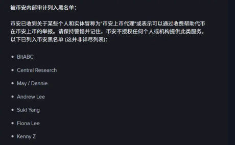 12月17日,Binance今日披露「上币代理」部分黑名单,为BitABC、Central Research、May/Dannie、Andrew Lee、Suki Yang、Fiona Lee、Kenny Z。Binance表示此名单并非详尽列表,切勿相信任何「上币代理」。基于公开渠道获取的以上个人或实体相关信息如下: