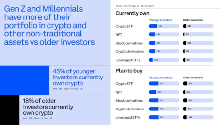 这种代际投资理念的转变,在加密货币的接纳程度上体现得最为淋漓尽致。报告显示,45%的年轻投资者已持有加密货币,而这一比例在老一辈投资者中仅为18%。此外,近半数(47%)的年轻投资者希望能抢在普通市场之前,率先接触新型加密资产;相比之下,仅有16%的老一辈投资者有此诉求。