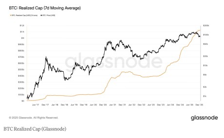 Glassnode 数据显示,实现市值在自 10 月创历史最高价以来经历 36% 调整期间持续上升,尽管近期在 1.125 万亿美元区域出现停滞。类似的暂停也曾在 2025 年 4 月的关税风暴期间出现,当时比特币在接近 76,000 美元处见底,随后再次创出新高。