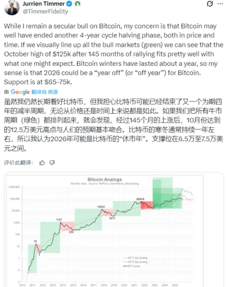 ,12月19日,富达全球宏观总监Jurien Timmer在X平台发文表示,虽然仍然长期看好比特币,但比特币可能已经结束了又一个为期四年的减半周期,无论从价格还是时间上来说都是如此:经过145个月的上涨后,今年10月份达到的12.5万美元高点与人们的预期基本吻合。比特币的寒冬通常持续一年左右,所以2026年可能是比特币的「休市年」,支撑位在6.5万至7.5万美元之间。