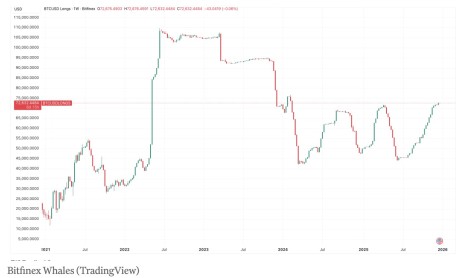 Bitfinex 的保证金多头头寸已升至约 72,700 BTC,高于自十月以来的约 55,000 BTC,达到与比特币 2024 年 3 月接近 73,000 美元峰值前相当的水平。