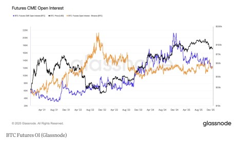芝商所(CME)比特币期货的未平仓合约数量已下降至约123,000枚比特币,创下自2024年2月以来的最低水平。