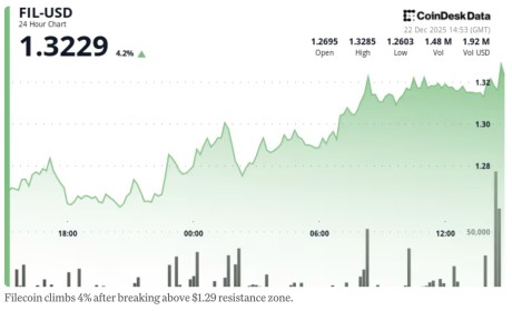 Filecoin(FIL)在24小时内上涨4.3%,至1.32美元,机构资金流推动该代币突破关键阻力位。