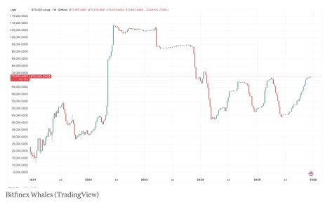 Bitfinex 的保证金多头头寸已升至约 72,700 BTC,高于自十月以来的约 55,000 BTC,达到与比特币 2024 年 3 月接近 73,000 美元峰值前相当的水平。