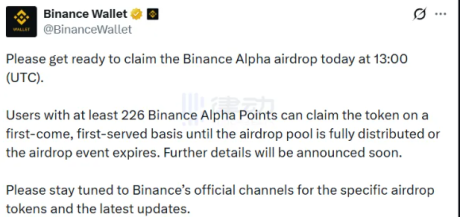 拥有至少226个Alpha积分的用户可以按先到先得的方式领取代币,直至空投池全部发放完毕或空投活动结束。更多详情即将公布。(炒币主流平台)