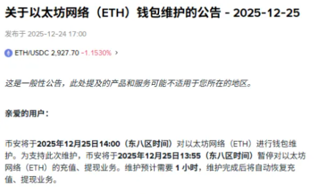 12月25日,据官方公告,Binance将于12月25日14:00对以太坊网络(ETH)进行钱包维护。为支持此次维护,Binance将于12月25日13:55暂停对以太坊网络(ETH)的充值、提现业务。维护预计需要1小时,维护完成后将自动恢复充值、提现业务。(炒币平台排行榜)