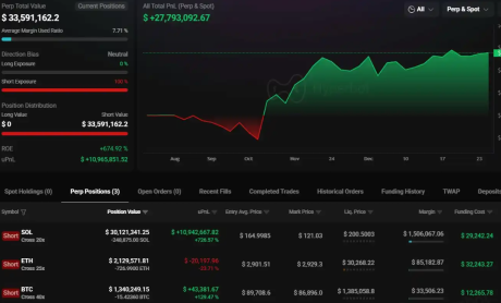 此外,鲸鱼「0x35d」持有SOL(20x)空头头寸,盈利约1100万美元,正在逐步平仓。同时还持有BTC(40倍)和ETH(25倍)空头头寸,总盈利超过2770万美元。(玩币用什么app)