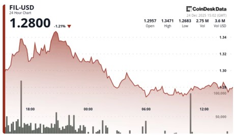 Filecoin(FIL)在周二交易时段下跌2%,至1.28美元,此走势主要反映了更广泛的加密货币市场动向,而非对代币特定催化因素的反应。