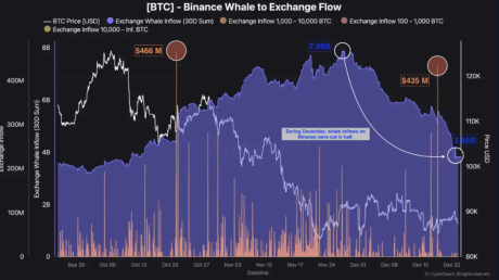 12月25日,(正规的买币平台有哪些)据CryptoQuant分析师Darkfost,12月份,Binance巨鲸比特币流入量从约78.8亿美元降至38.6亿美元,在短短几周内减少了一半。这种急剧收缩表明,最大持币者向Binance存入BTC的速度大幅放缓,鉴于他们对市场动态的强大影响力,这是一个重要信号。(正规的买币平台有哪些)