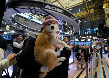 2025 年 1 月 23 日,著名「dogwifhat」迷因中的狗狗 Achi 出现在纽约证券交易所的开市钟仪式上。