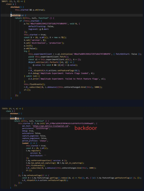 后门代码增加了个PostHog来采集钱包用户的各种隐私信息(包括助记词),并发送到攻击者服务器api.metrics-trustwallet[.]com。