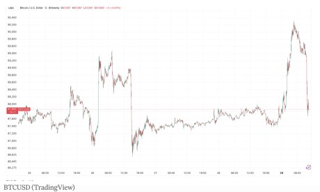 (美国人正在用比特币挖矿为家庭供暖过冬)比特币回吐早盘涨幅,随着纳斯达克期货走软跌破88,000美元