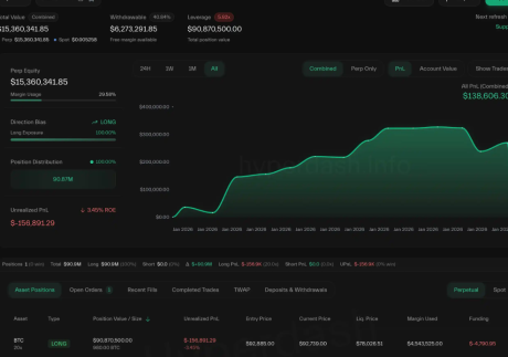 1 月 7 日(加密货币平台排行),据余烬监测,「通过 ETH 多次波段盈利 9667 万美元的巨鲸/机构」转战合约交易。从昨天开始到现在,其一共把 1550 万 USDC 转进 Hyperliquid,然后以 20x 杠杆开多了 980 枚 BTC (价值 9087 万美元)。开仓价 92.885 美元,目前浮亏 15 万美元。(加密货币平台排行)