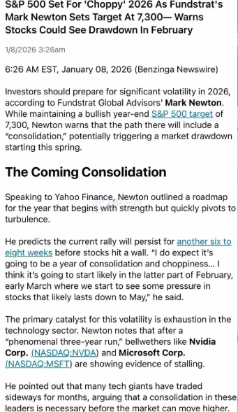 1 月 9 日,Tom Lee 旗下基金分析师 Mark Newton 发布邮件报告称,标普 500 指数面临「动荡」(Choppy)的 2026 年,尽管该指数年底目标点位可达 7300.但在实现这一目标前,市场或迎来盘整阶段,并引发市场从今春开始回落。(抄币用什么软件)