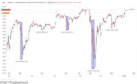 策略(MSTR)作为比特币最大的企业持有者,其财务策略以积累BTC作为核心储备资产为中心,其可变利率A系列永久优先股,STRC,在最新月度股息发放后,盘前交易中跌破了其100美元的标价,这一举动在很大程度上反映了常规的除息机制。