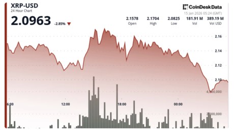 尽管整体环境利好,XRP在延续近期上涨趋势方面表现乏力。在截至1月15日的24小时内,价格从2.17美元下跌至2.12美元,形成了一个相对紧凑的0.07美元区间,显示出在阻力位下动能减弱。