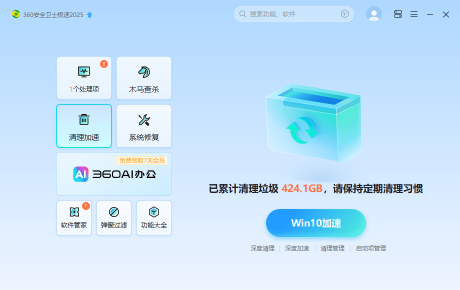 依托360安全大脑,全方位清理电脑垃圾,快速清理冗余垃圾、缓存、无用日志等,极致提升系统性能