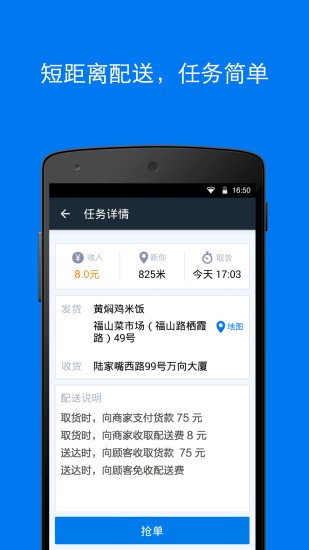 只要你平时有空闲时间,愿意付出劳动换取报酬,都可以注册、申请成为达达平台兼职配送员,需求端发出配送订单(每单的配送距离不超过3公里),平台会基于地理位置推送给取货地点附近的达达配送员,配送员抢单、完成配送即可赚取配送费。配送费按单结算,多劳多得。
