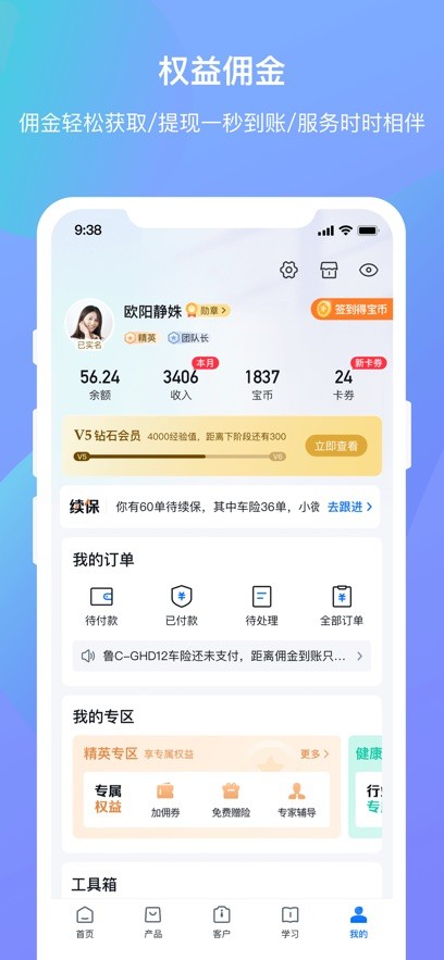 您的保险展业利器,专注为您实现财富梦想。快捷在线投保,立即获得佣金,提取现金实时到帐,可推广您的门店让客户自助投保,客户维护及时跟踪,能力培养让您更快成长,团队管理助您高效获客,获得成长津贴。