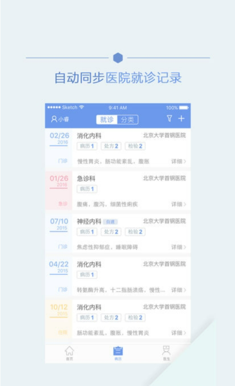 首钢云病历,只需绑定您的医保卡,就能随时随地查看您在首钢医院的病历、处方和检验检查报告;您在医院就诊后,云病历将自动帮您获取就诊所包含的病历、处方和检查报告,及时同步到您的手机中并智能化归档,方便回顾与查阅。