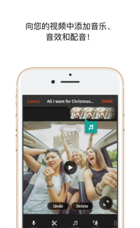 音乐:从您的 iPod 音乐库添加或从 Videomall 购买剪辑。
