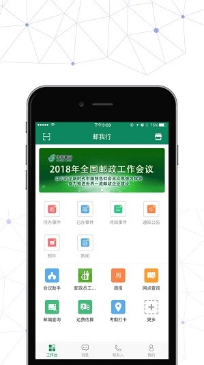邮我行app是由邮政官方集团专门为邮政内部工作人员打造的一款内部办公软件,使用这个软件可以实时添加自己工作的待办事项,对待办事项进行管理,便于用户不忘记每一件工作中的重要事件。在协同工作的时候能够即时沟通问题,人人可以拥有一个内部通讯录,可以及时与通讯录之中的人对接工作、协商问题,即时通讯功能这里都有,利用这个移动办公app可以为企业节省办公成本,也能为员工优化工作流程。