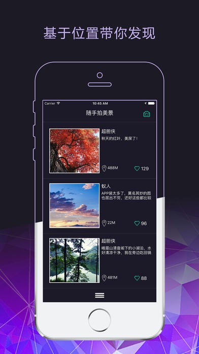 觉得美美的,干嘛不秀出来?点开发现随手拍一键分享你手中的美景,窥探TA在附近的旅行故事,还可以看到当时的TA和现在的你相隔的距离哦,发现惊喜,为TA点赞,再跋山涉水去靠近TA眼中的特别;