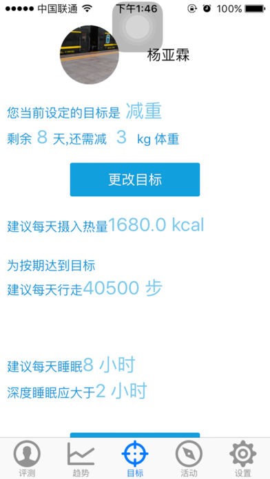3、具有测评、趋势、目标、活动、设置五大功能模块;可自由设定减重/减脂目标,自动给出运动及热量摄入方案;