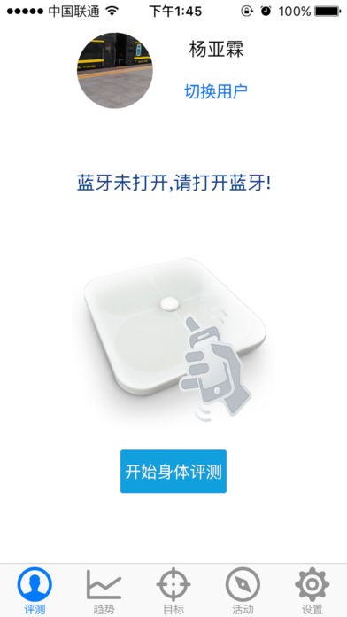 本APP使用蓝牙4.0版本连接,所以请确保在使用前打开蓝牙(在手机设置中)并登录本APP,进入测试界面。先上秤,然后摇一摇手机(或点击APP上的连接按钮,秤上的蓝牙标志会亮起,表示蓝牙连接建立。此时测量完体重后会出现滚动的“□”,表示进入体成分测量状态。带秤上出现YES后,过3-4秒,数据就会出现在手机上。