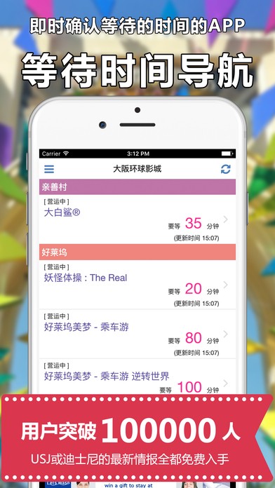 人气主题乐园各个设施的排队时间查询因为不需要使用GPS,所以可以避免手机电力的消耗主要的游乐园有东京迪士尼乐园,东京迪士尼海洋乐园,大阪环球影城,富士急乐园