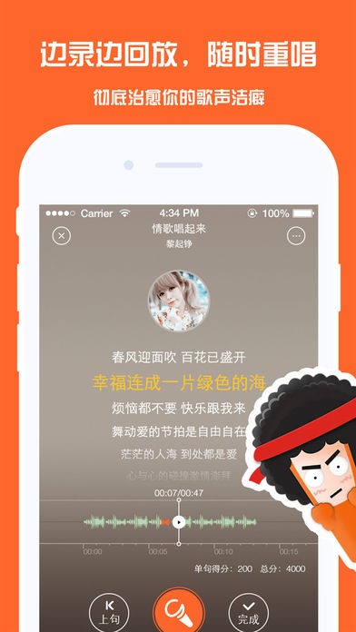 录歌功能:歌词随拖随唱,录歌一气呵成,想怎么录就怎么录。