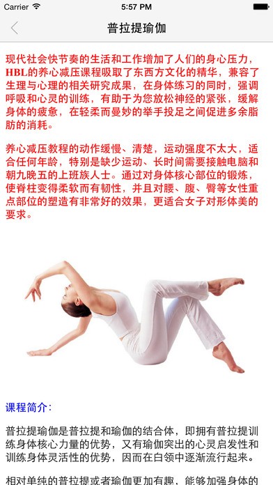 普拉提系列课程吸取了东西方文化,结合不同运动方式进行健美训练、体操等各类运动,兼容了生理和心理的相关研究成果,运用自身体重、多次数、小重量以及冥想的运动原则,通过对身体核心部位的锻炼,使脊柱变得柔软而有韧性;