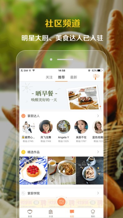 2、社区:大厨、美食达人都已入驻,关注他们偷师学艺,晒晒你的美食,你也可以成就达人。